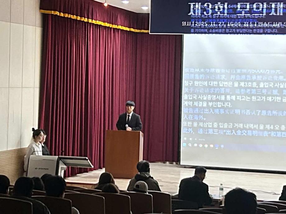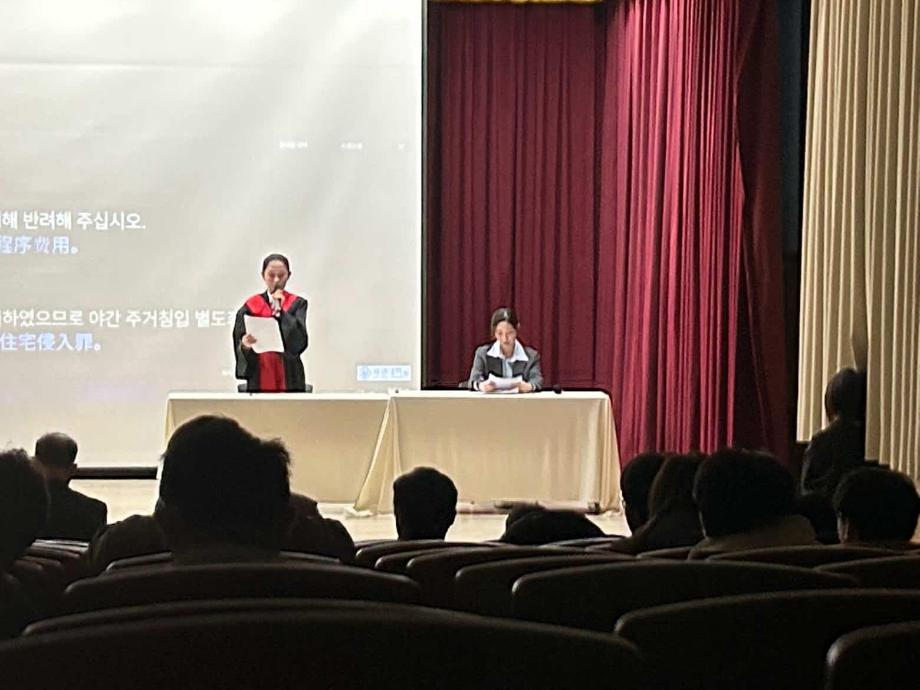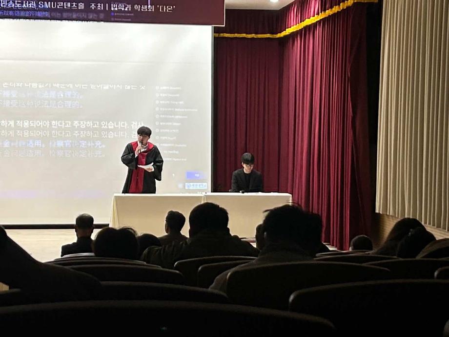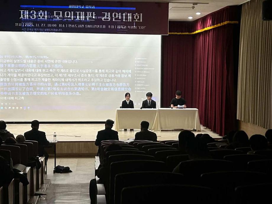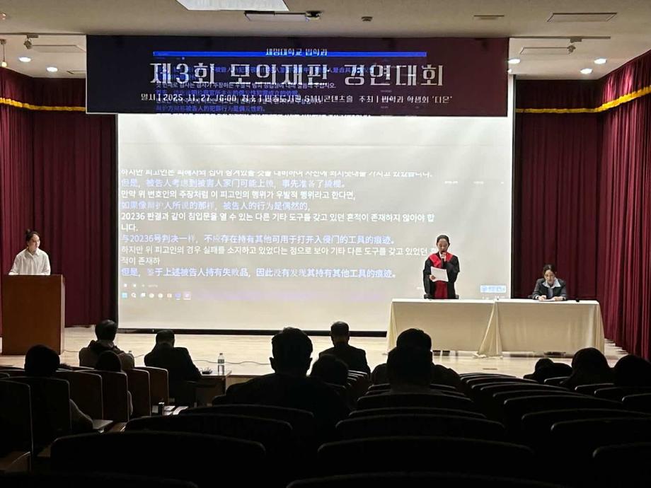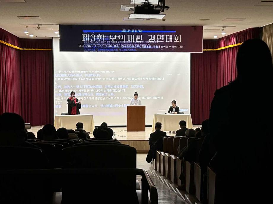 본문 시작 홈으로 커뮤니티 학과안내 교수소개 학과과정 커뮤니티 홈페이지가이드 학과사진첩 공지사항 취업정보 학과사진첩 학과행사 동아리 학생회 교우소식 학과사진첩 페이스북 트위터 프린트 2025학년도 제3회 법학과 모의재판 경연대회 법학과 378 2025-12-03 2025년 11월 27일 민송도서관 1층 콘텐츠홀에서 법학과 모의재판 경연대회 진행하였습니다. 참여하신 모든 분들 고생 많으셨습니다. 목록 이전2025학년도 법학과 특강 담당부서 : 법학과 담당자 : - 연락처 : 043-649-1764 최종수정일 : 2024-10-26 만족도조사 만족도 조사 이 페이지에서 제공하는 정보에 대하여 만족하시나요? 매우만족 만족 보통 불만족 매우불만족
