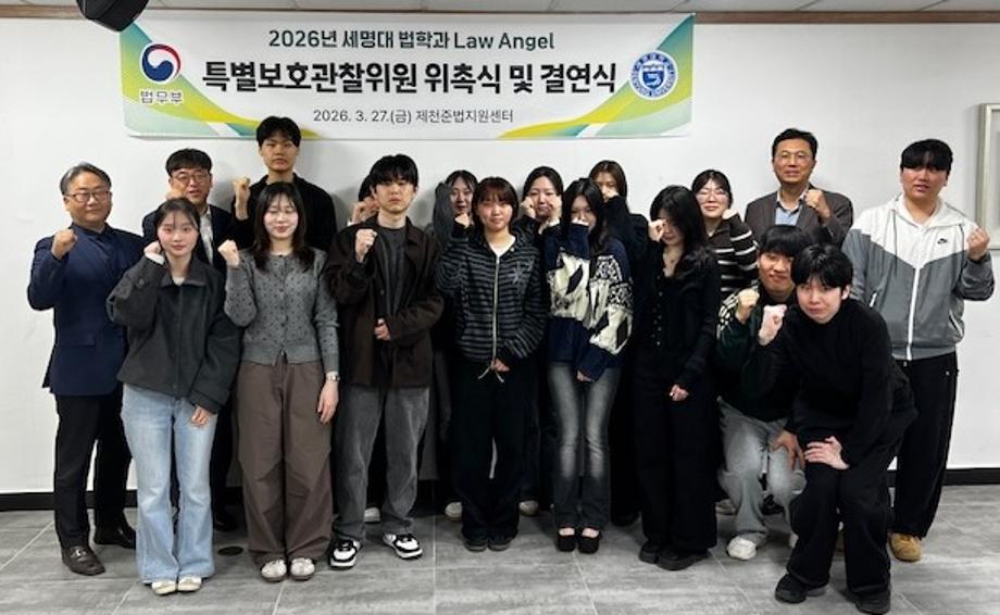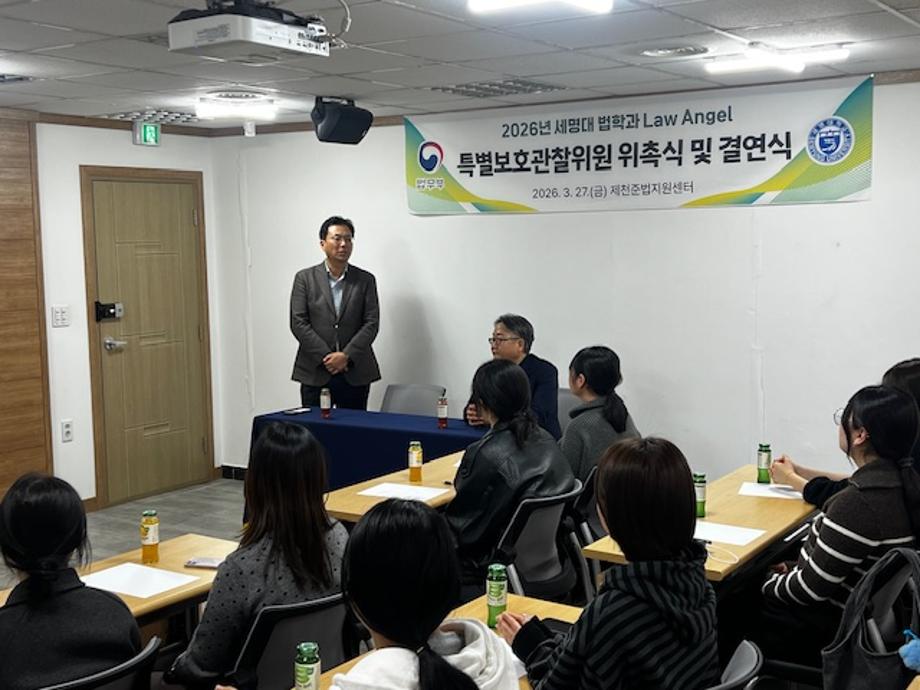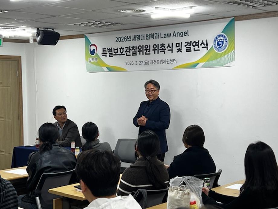 본문 시작 홈으로 커뮤니티 학과안내 교수소개 학과과정 커뮤니티 홈페이지가이드 학과사진첩 공지사항 취업정보 학과사진첩 학과행사 동아리 학생회 교우소식 학과사진첩 페이스북 트위터 프린트 2026. 03. 27. Law Angel 위촉식 법학과 399 2026-04-01 지난 3월 27(금) 15:30에 제천보호관찰소에서 로엔젤 학생들이 특별보호관찰위원 위촉식을 진행하였습니다. 목록 이전겨울방학 해외 배낭여행-푸꾸옥 담당부서 : 법학과 담당자 : - 연락처 : 043-649-1764 최종수정일 : 2024-10-26 만족도조사 만족도 조사 이 페이지에서 제공하는 정보에 대하여 만족하시나요? 매우만족 만족 보통 불만족 매우불만족