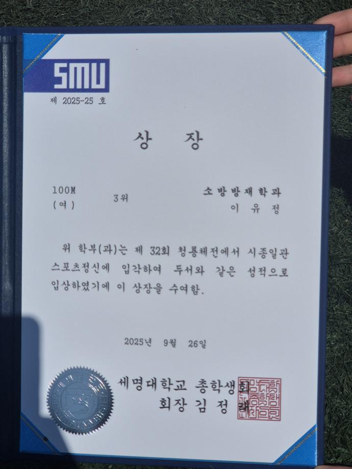 본문 시작 홈으로 커뮤니티 학과소개 교수소개 전공과정 커뮤니티 홈페이지가이드 학과행사 학과공지 채용정보 학사일정 학과행사 동아리 소방방재학과의 자랑 궁금합니다 수험생 Q&A 학과행사 페이스북 트위터 프린트 2025학년도 제32회 청룡체전 소방방재학과 소방방재학과 671 2025-09-23 2025년 9월 23일 ~9월 25일 제32회 청룡체전 기간동안 여자 피구, 남자 축구, 남자 농구, 혼성 계주, 여자 100m, 남자 100m 참가하였습니다. 선수분들 모두 수고하셨고, 응원해주신 학우분들 감사드립니다! 목록 이전KICT 화재안전연구소 견학 담당부서 : 소방방재학과 담당자 : - 연락처 : 043-649-1787 최종수정일 : 2024-10-26 만족도조사 만족도 조사 이 페이지에서 제공하는 정보에 대하여 만족하시나요? 매우만족 만족 보통 불만족 매우불만족