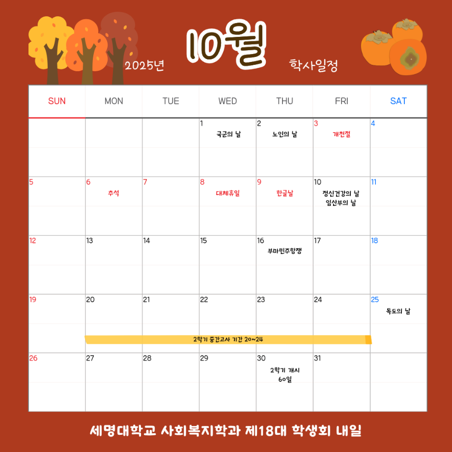 본문 시작 홈으로 커뮤니티 학과소개 교수소개 교육과정 현장실습 및 취업정보 커뮤니티 홈페이지가이드 학사일정 학과공지 학사일정 학생회 동아리 학생 소통 광장 포토갤러리 전공자료실 서식자료실 학사일정 페이스북 트위터 프린트 10월 학사 일정 사회복지학과 72 2025-09-30 2025년도 10월 학사 일정입니다. 목록 이전9월 학사 일정 담당부서 : 사회복지학과 담당자 : 한상윤 연락처 : 043-649-1799 최종수정일 : 2024-10-26 만족도조사 만족도 조사 이 페이지에서 제공하는 정보에 대하여 만족하시나요? 매우만족 만족 보통 불만족 매우불만족