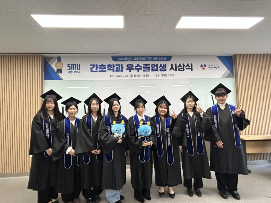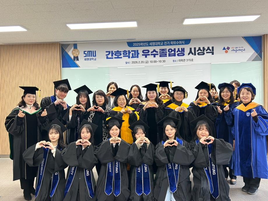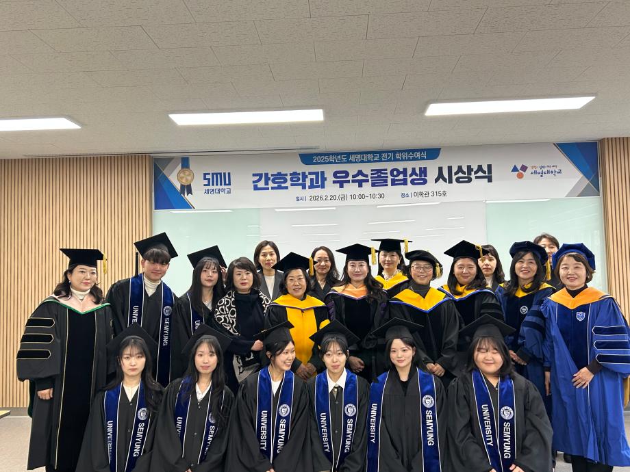 본문 시작 홈으로 커뮤니티 학과소개 교수소개 교육과정 학과소식 학과특성화 사업 커뮤니티 홈페이지가이드 포토갤러리 학사일정 포토갤러리 학생회 학과동아리 학과 취업정보 동창회 학과운영개선의견 발전기금 포토갤러리 페이스북 트위터 프린트 2025학년도 세명대학교 간호학과 학위수여식🎓 간호학과 869 2026-02-23 세명대학교 간호학과 졸업생들은 2025학년도 학위수여식을 통해 4년간의 배움과 성장을 마무리하고 새로운 출발선에 섰습니다. 빛나는 졸업의 순간이 담긴 현장이 궁금하시다면, 아래 링크를 클릭해 주세요. 👉 [학위수여식 현장 보러가기] https://blog.naver.com/nursing_smu_official/224192111491 목록 이전세명대학교 간호학과 제66회 간호사 국가시험 임장지도 실시 다음 2026학년도 꿈설계학기 담당부서 : 간호학과 담당자 : - 연락처 : 043-649-1357 최종수정일 : 2024-10-26 만족도조사 만족도 조사 이 페이지에서 제공하는 정보에 대하여 만족하시나요? 매우만족 만족 보통 불만족 매우불만족