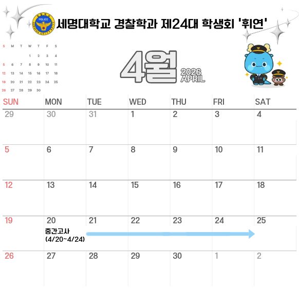 본문 시작 홈으로 커뮤니티 학과소개 교수소개 학과과정 커뮤니티 홈페이지가이드 학부공지 학부공지 학과일정 포토갤러리 학생회 동아리 학부공지 페이스북 트위터 프린트 4월 학사달력 경찰학과 조회 : 37 등록일 : 2026-04-01 안녕하십니까 세명대학교 경찰학과 제24대 학생회 ‘휘연‘입니다. 4월 학사일정입니다. 📌4/20~4/24 : 중간고사 4월에는 중간고사가 있습니다. 날짜를 잘 확인시기를 바랍니다. 기타 문의 사항은 연락해 주시면 답변드리겠습니다. 목록 이전2026 경찰학과 MT 만족도조사 만족도 조사 이 페이지에서 제공하는 정보에 대하여 만족하시나요? 매우만족 만족 보통 불만족 매우불만족