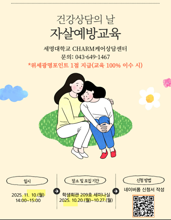 본문 시작 홈으로 학과생활 학과소개 교수소개 교과과정 학과생활 홈페이지가이드 사진게시판 공지사항 사진게시판 전공자료실 동아리 학과행사 사진게시판 페이스북 트위터 프린트 [CHARM케어상담센터] 2025학년도 2학기 자살예방교육 진행 안내 산업디자인학과 46 2025-10-21 목록 이전[긴급공지] 최근 급증 중인 '캄보디아 불법 고용, 납치' 사례 주의 안내 다음 [CHARM케어상담센터] 2025학년도 2학기 알코올중독 예방 및 스트레스 대처 관련 교육 진행 안내 담당부서 : 산업디자인학과 담당자 : 류상현 연락처 : 043-649-1436 최종수정일 : 2024-10-26 만족도조사 만족도 조사 이 페이지에서 제공하는 정보에 대하여 만족하시나요? 매우만족 만족 보통 불만족 매우불만족