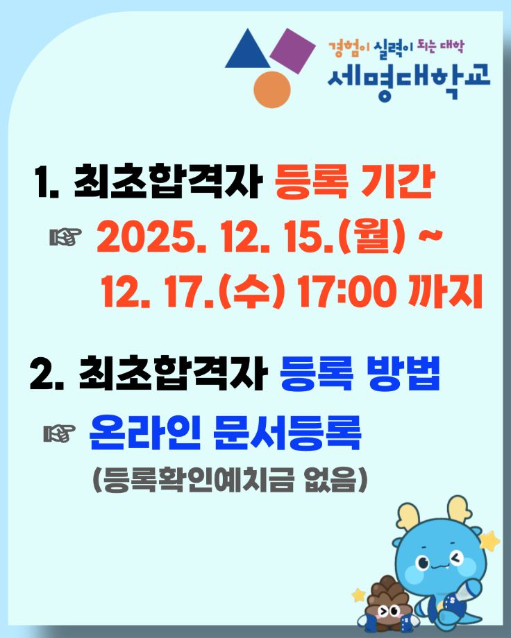 본문 시작 홈으로 학과생활 학과소개 교수소개 교과과정 학과생활 홈페이지가이드 사진게시판 공지사항 사진게시판 전공자료실 동아리 학과행사 사진게시판 페이스북 트위터 프린트 [수시모집] 2026학년도 수시모집 최초합격자 등록안내 산업디자인학과 82 2025-12-15 목록 이전[설경] 세명대학교 설경 다음 [수시모집] 2026학년도 수시모집 충원합격자 발표안내 담당부서 : 산업디자인학과 담당자 : - 연락처 : 043-649-1436 최종수정일 : 2024-10-26 만족도조사 만족도 조사 이 페이지에서 제공하는 정보에 대하여 만족하시나요? 매우만족 만족 보통 불만족 매우불만족