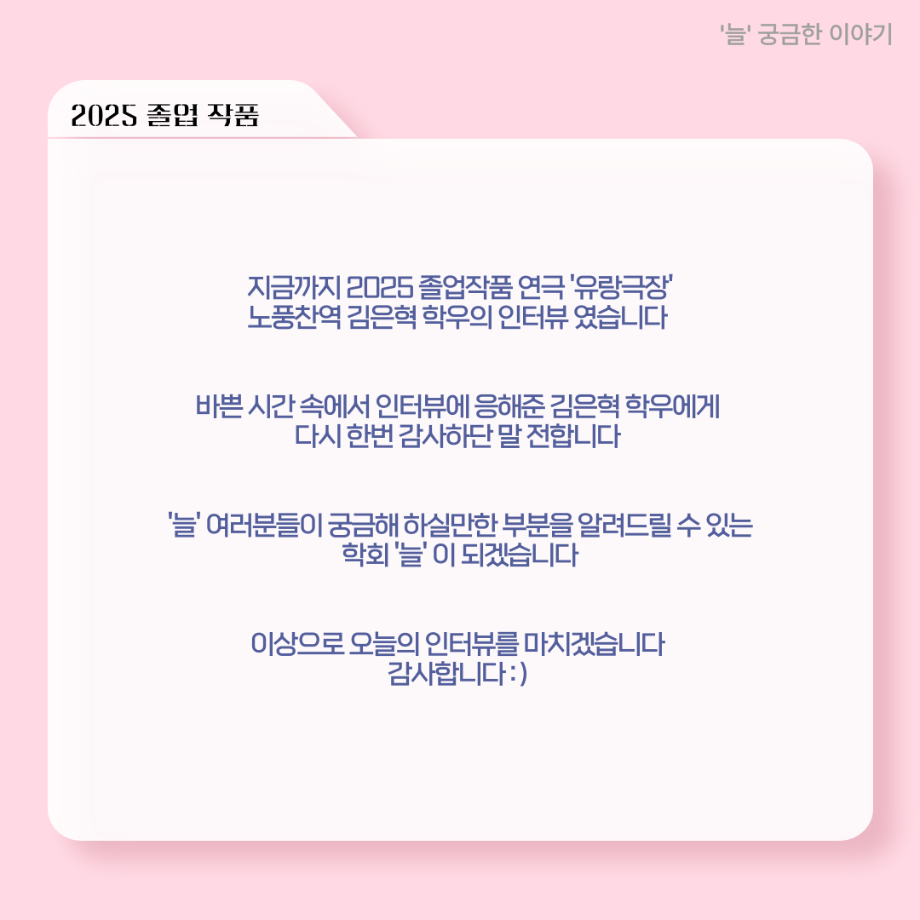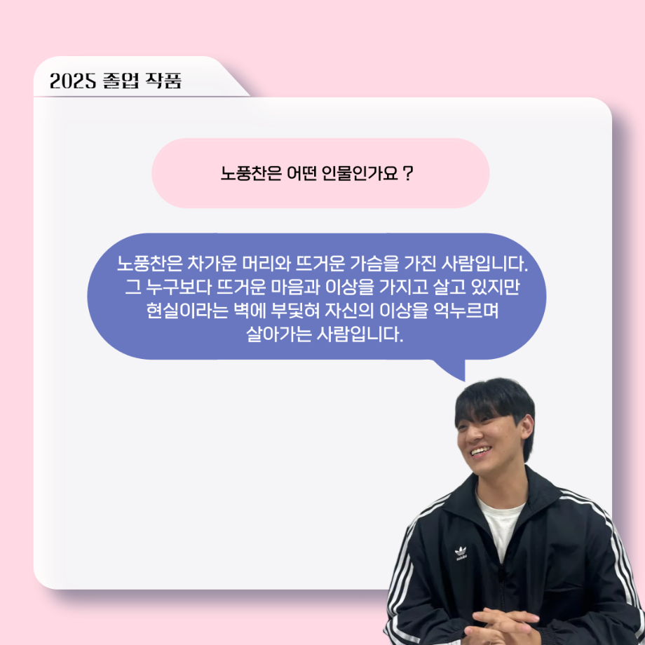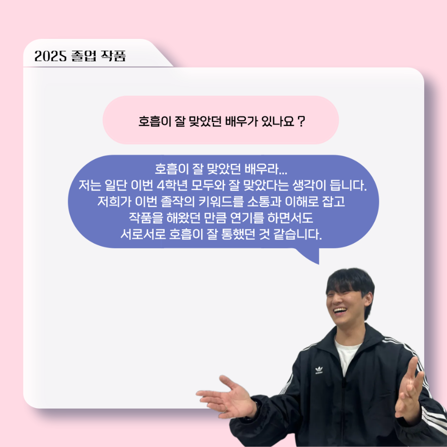 본문 시작 홈으로 커뮤니티 학과소개 입학정보 교수소개 학과과정 커뮤니티 공연예매 안내 홈페이지가이드 포토갤러리 공지사항 포토갤러리 작품DB 동아리 학사일정 학생회 포토갤러리 페이스북 트위터 프린트 ‘늘‘ 궁금한 이야기 - 2025 졸업작품 ‘유랑극장’ 노풍찬役 < 김은혁 > 연기예술학과 261 2025-12-05 . 목록 이전‘늘‘ 궁금한 이야기 - 하계 프로젝트 ‘사랑의 온도’팀 주지환役 < 신승현 > 담당부서 : 연기예술학과 담당자 : - 연락처 : 043-649-1733 최종수정일 : 2024-10-26 만족도조사 만족도 조사 이 페이지에서 제공하는 정보에 대하여 만족하시나요? 매우만족 만족 보통 불만족 매우불만족