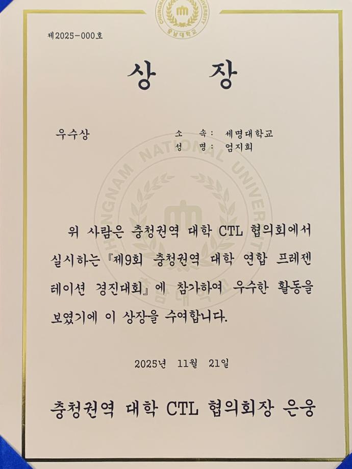 본문 시작 홈으로 매력적인 학과소개 매력적인 학과소개 흥미로운 교육과정 특별CC프로그램 We can 취업 따뜻한 커뮤니티 홈페이지가이드 지금 우리 광홍은 학과개요 학과연혁 교수소개 Wilco로 보는광고홍보학과 지금 우리 광홍은 지금 우리 광홍은 페이스북 트위터 프린트 25학번 엄지희_충청권역 대학 연합 프레젠테이션_우수상 광고홍보학과 55 2025-11-24 우리 광고홍보학과 25학번 엄지희 학생이 '제9회 충청권역 대학 연합 프레젠테이션 경진대회'에서 우수상을 수상했어요. ^^ 훌륭하고, 대견합니다. 진심으로 축하합니다. '기획 맛집' 세명대 광고홍보학과!!! '발표 맛집' 까지... 목록 이전2025-2학기 개강총회