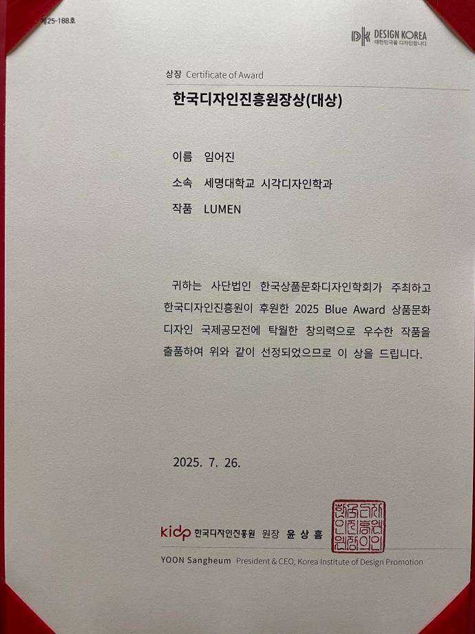 본문 시작 홈으로 학과자랑 학과소개 학과과정 시영소식 입학/AI 학과자랑 SNS소통 홈페이지가이드 학과자랑 학과자랑 학과갤러리 동아리 졸업전시회 학과자랑 페이스북 트위터 프린트 2025 블루어워드 국제공모전 - 대상 수상 (임*진 학생) 시각영상디자인학과 300 2025-09-04 대상 수상 축하합니다~ 목록 이전2025학년도 후기(순수외국인) 경희대학교 일반대학원 박사과정 합격 - 이* 학생 다음 2025 자기설계 해외배낭연수 - 시각영상디자인학과 3명(합격) 참여 만족도조사 만족도 조사 이 페이지에서 제공하는 정보에 대하여 만족하시나요? 매우만족 만족 보통 불만족 매우불만족