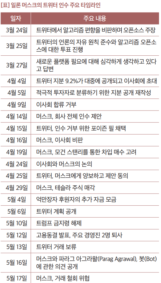 머스크는 트위터를 인수하고 비공개 회사로 전환하기로 한 이후 “신뢰를 높이기 위해 알고리즘을 오픈소스로 만드는 것”에서부터 스팸봇을 처리하고 “모든 사람을 인증하는 것”에 이르기까지 다양한 목표에 대해 논의했다. 트위터는 정치적 분열과 허위 정보 확산에 기여한다는 비판에 시달리기도 했으며, 일부사람들은 트위터의 콘텐츠 조정 정책이 허위 정보 확산을 방지하기에는 적절하지 않다고 보았다.