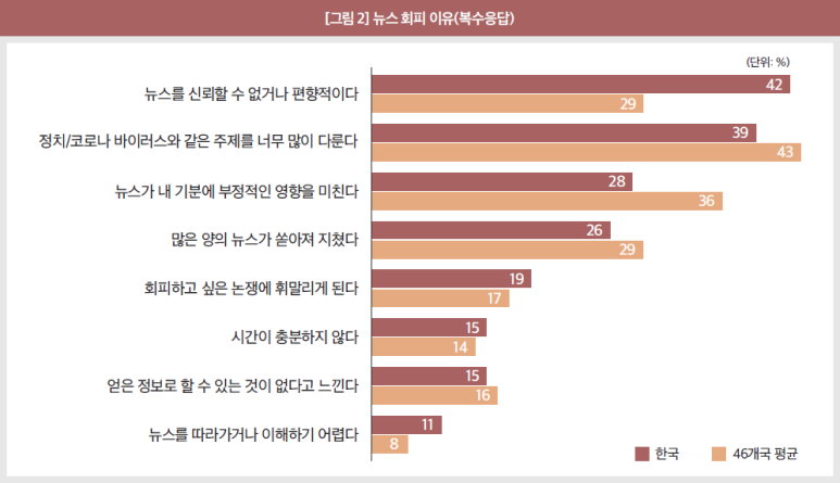 제 목 : <디지털 뉴스 리포트 2022 한국> _ 한국 이용자 3명 중 2명 뉴스 회피 ‘뉴스 불신’ 때문