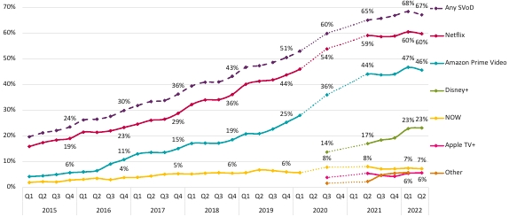 영국 미디어 산업에서 넷플릭스와 같은 구독형 주문형 비디오(SVoD)가 처음으로 역성장을 기록하고 있습니다. 팬데믹 효과로 인해 SVoD 시장이 빠르게 시장 성숙기로 진입함으로써 가입자 성장동력이 둔화했고, 경기침체가 SVoD 가입자 이탈을 유발하고 있기 때문입니다.