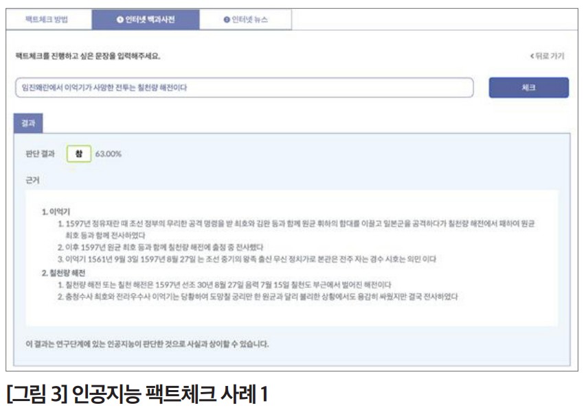 최근 인공지능 기반의 팩트체크 연구가 활발히 진행되고 있습니다. 아직은 가짜뉴스가 가진 기만성까지 파악하는 기술 개발은 어렵지만, 신뢰성 있는 소스를 통해 제시된 주장이 얼마나 지지받는지를 파악하는 것은 어느 정도 가능하다고 합니다.
