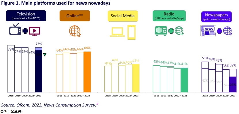 "오프콤이 온라인 뉴스에서의 소셜미디어 영향에 관한 분석 보고서 <온라인 뉴스>(Online news)를 발간했다. 보고서 내용에 따르면 TV, 라디오, 신문 등 전통적 언론매체를 통한 뉴스 소비는 감소하고, 소셜미디어 등 온라인 플랫폼을 통한 뉴스 소비는 증가하고 있는 것으로 나타났다. 또한, 전통 언론사들의 온라인 뉴스는 상당 부분의 트래픽을 소셜미디어 등 타 온라인 플랫폼에 의존하고 있는 것으로 조사되었다."