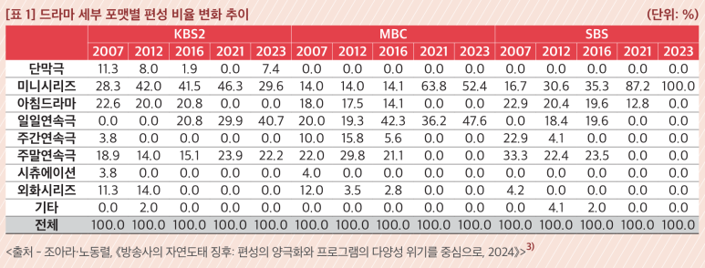 글로벌 OTT 중심으로 생태계가 재편된 상황에서, 방송사들은 내수시장의 함정이라는 어려움과 함께 '편성 장르·포맷의 양극화'와 '제작 프로그램 축소', '재방송 비율 증가'라는 생존 전략을 구사하고 있습니다.